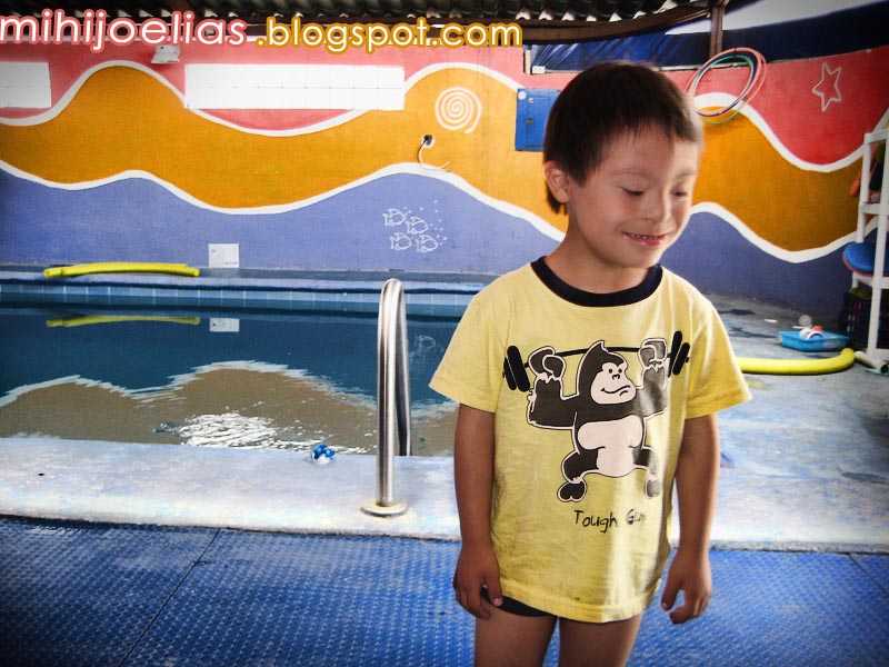 El primer día no tenía muchas ganas de meterse, primero se sento a la orilla de la alberca a patalear, hasta que lo jale y lo metí. Ahhh porque yo me tengo que meter con el!