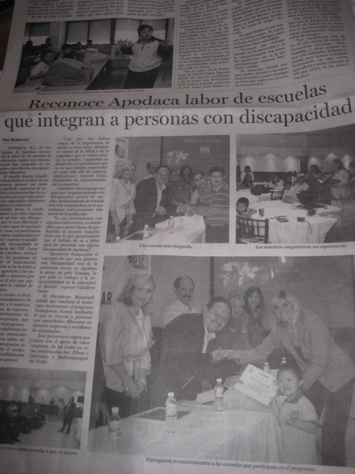 Hace dos semanas nos invitaron al 4to intercambio sobre experiencias de integración escolar. Ayer la directora del Centro Down me recibió con la noticia de que había salido Elías en el periódico,y me lo da. Es una impresión gratuita del Gobierno de Apodaca.