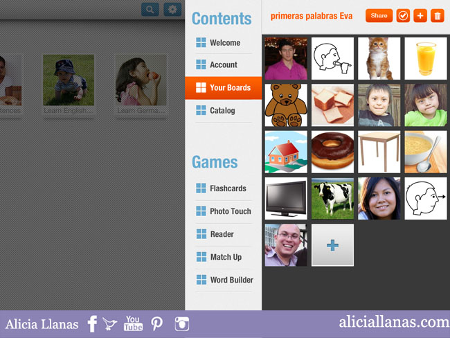 Hasta ahora sólo he hecho un tablero, donde vienen las palabras que hasta el día de hoy sabe Eva, hace un rato le enseñe esta aplicación por primera vez, y esta encantada jugando, le gusto mucho!